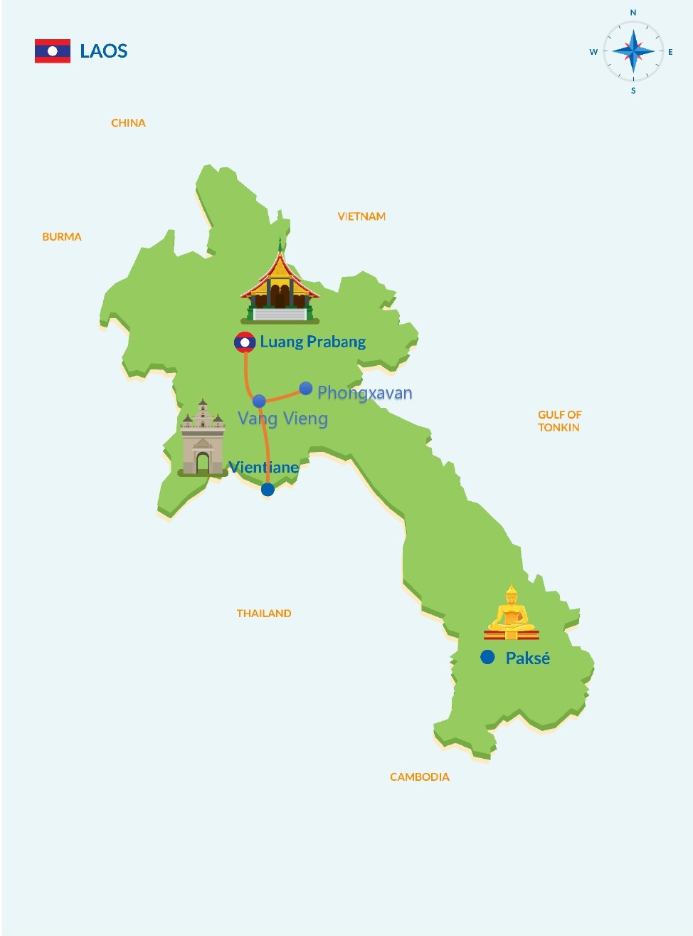 Quittez Phongsavan pour emprunter la route panoramique menant à Vang Vieng, petite ville située sur les méandres de la rivière Nam Song. Les paysages y sont spectaculaires avec ses affleurements calcaires restés intacts, malgré les développements récents amenés par l'avènement du tourisme. Il s’agit d’un trajet intense et mouvementé, sur une route parsemée de nids-de-poule.