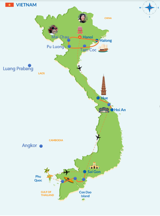 Rizières à perte de vue, Hanoï et son vieux quartier, découverte des ethnies minoritaires au nord de Hanoi, balades dans les arroyos du delta du Mékong, visite des temples et des pagodes de Hue et Hoi An, sans oublier l’incontournable et féerique baie d’Halong et les plages féeriques de Phu Quoc. Ce voyage est une traversée du Vietnam du Nord au Sud à la découverte de ses paysages fascinants, de sa richesse culturelle, de sa cuisine délicieuse et de l’accueil toujours très hospitaliers de ses habitants.