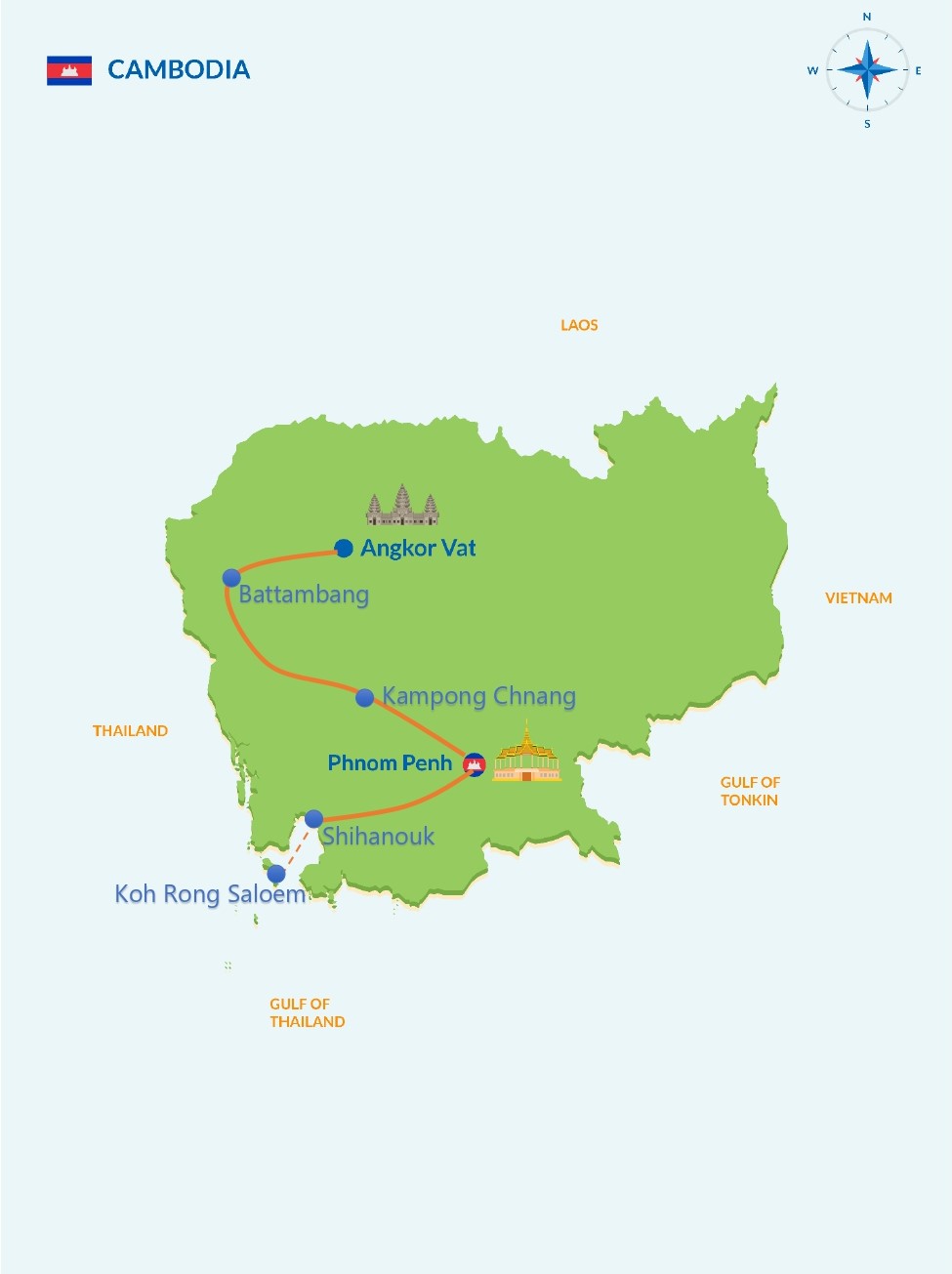 Un voyage hors des sentiers battus à travers les temples millénaires de Siem Reap, les villages préservés de l'afflux touristique, les hameaux lacustres et les villes charmantes. C'est l'occasion de découvrir une histoire riche, une vie quotidienne authentique et des monuments architecturaux grandioses. Votre circuit Cambodge authentique se terminera par trois nuits sur l’île de Koh Rong Saloem, un paradis terrestre.