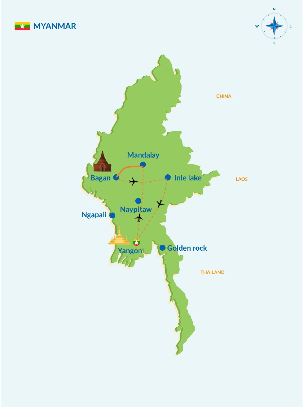 Grands marchés colorés, féerie du lac Inlé et à Bagan, pagode Shwedagon, rencontres ethniques, magie des temples et pagodes de Bagan, lavage matinal du visage du Bouddha Mahamuni, activités fluviales, thanaka sur les joues des femmes et enfants, files de moines le matin… et bien sûr le sourire des Birmans.
