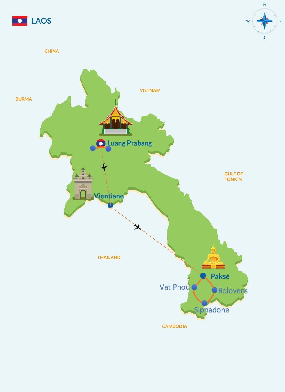 Des pagodes anciennes de Luang Prabang aux runes des temples Khmer de Paksé ; des maisons coloniales aux champs de café sur le plateau des Bolovens; des villages authentiques à Luang Prabang à la vie quotidienne des pêcheurs au sud; des massages traditionnels aux hôtels de charme… ce voyage vous offrira les images intéressantes d’un pays du million d’éléphants ainsi que des moments de repos en mode confortable.